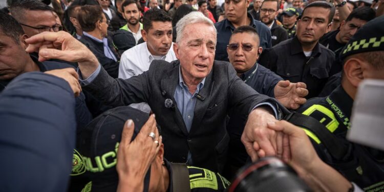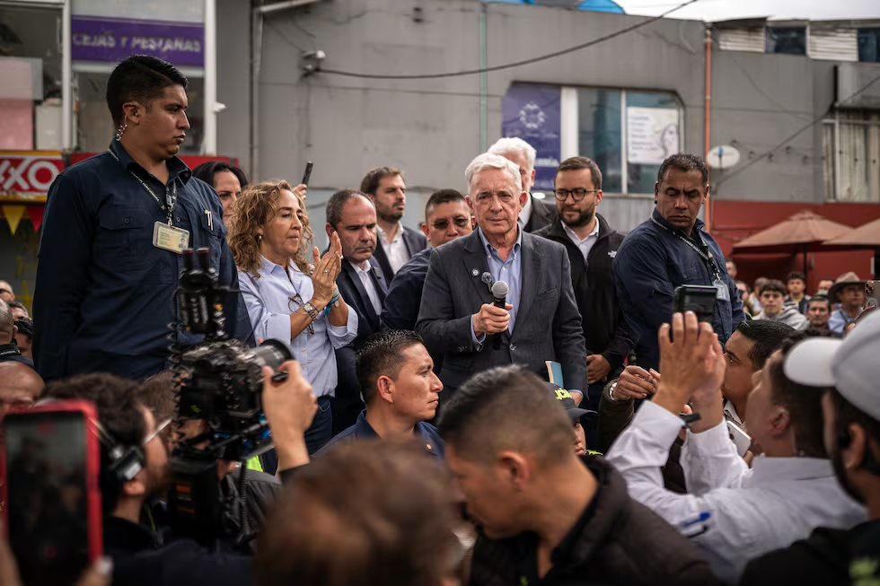 Antes de llegar al parque, el expresidente visitó la tumba del fallecido exsenador en el tradicional Cementerio Central de la capital colombiana. Uribe no había podido asistir al entierro ni a las honras fúnebres porque estaba privado de la libertad, cumpliendo en su casa cerca a Medellín una pena de 12 años de prisión, por los delitos de soborno en actuación penal y fraude procesal. Sin embargo, el pasado martes el Tribunal de Bogotá falló en su favor una tutela que le ha permitido esperar en libertad la decisión de segunda instancia de un caso que ha concentrado la atención del país.
