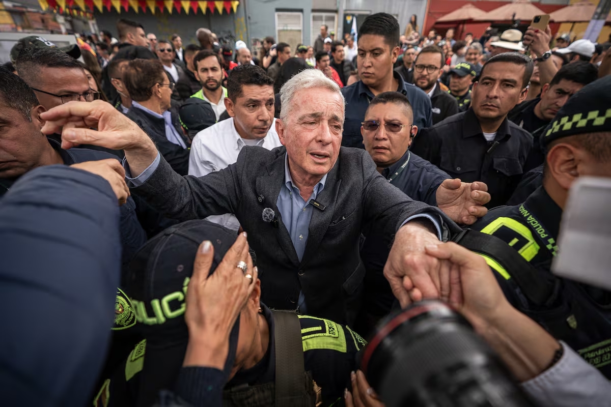 Antes de llegar al parque, el expresidente visitó la tumba del fallecido exsenador en el tradicional Cementerio Central de la capital colombiana. Uribe no había podido asistir al entierro ni a las honras fúnebres porque estaba privado de la libertad, cumpliendo en su casa cerca a Medellín una pena de 12 años de prisión, por los delitos de soborno en actuación penal y fraude procesal. Sin embargo, el pasado martes el Tribunal de Bogotá falló en su favor una tutela que le ha permitido esperar en libertad la decisión de segunda instancia de un caso que ha concentrado la atención del país.